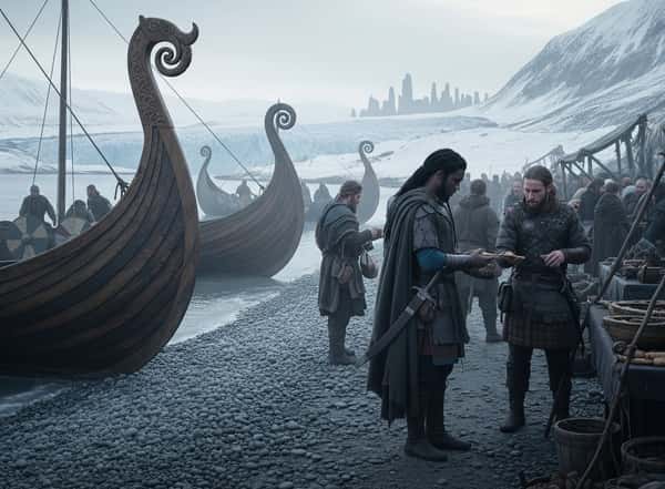 Finally, after several days a silhouette is spotted in the sky. Some say it is a gull, but a young skald looks at it and swears it is a distant dragon, which spreads both amusement and unease among the crew. Regardless, it gives the steersman a direction to go. Before long, peaks can be seen and when the fog breaks a makeshift natural harbor is found that leads to a collection of beached ships, tents and shacks, as well an imposing collection of distant, stark black structures beyond the nearest hills.
