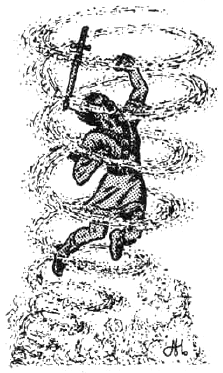 If a character is ‘hit’ by the vortex, he suffers no immediate damage but is caught in the whirling cone of air and starts to spin. Thereafter he can only be released when the vortex is killed and he will take 1-3 hit points of damage per round as a result of the spin. Additionally there is a 5% cumulative chance per melee round of a spinning victim being killed by a particularly violent air current.