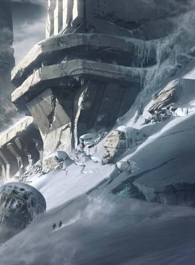 A collection of titanic structures of cyclopean, black stone, rising from the ice like a jagged, fallen star. Angles twist where they shouldn’t, surfaces absorb light, and a palpable, chilling wrongness emanates from its silent, unmoving form. It feels ancient, unnatural, and utterly hostile.